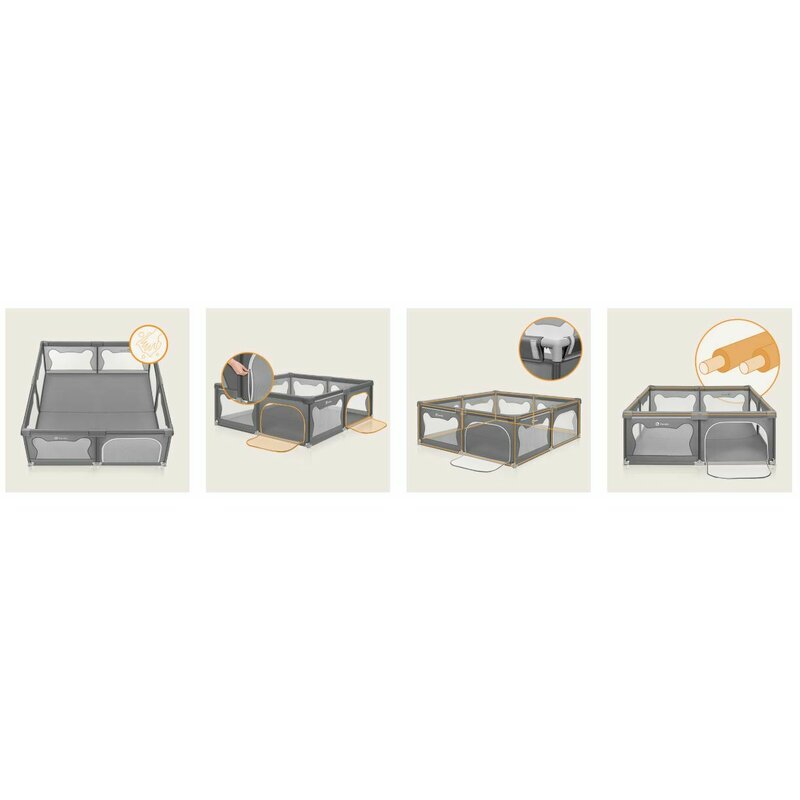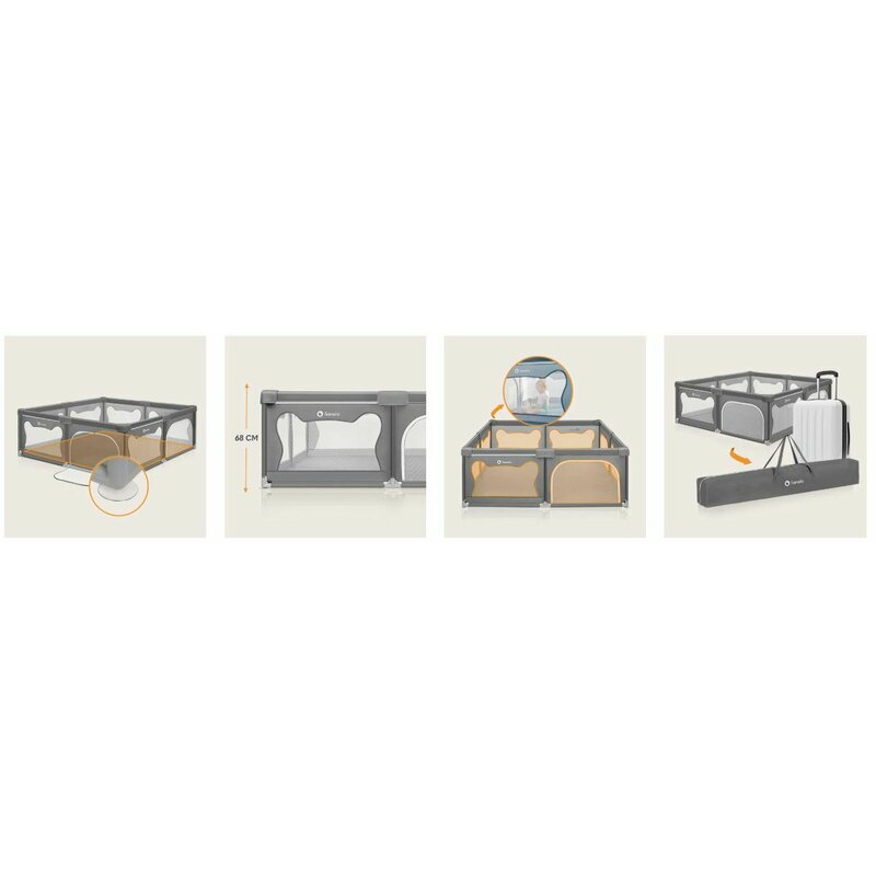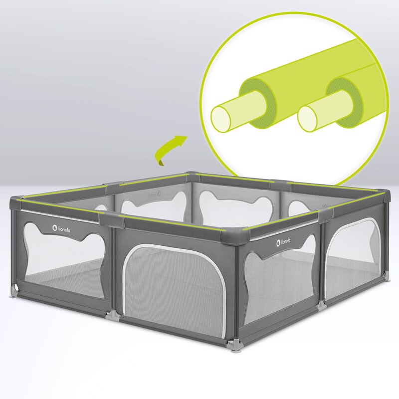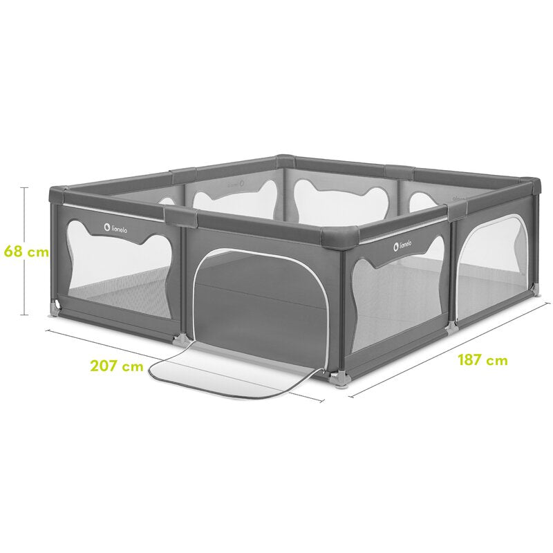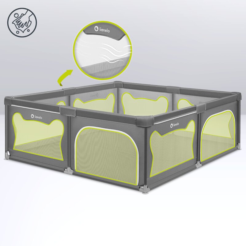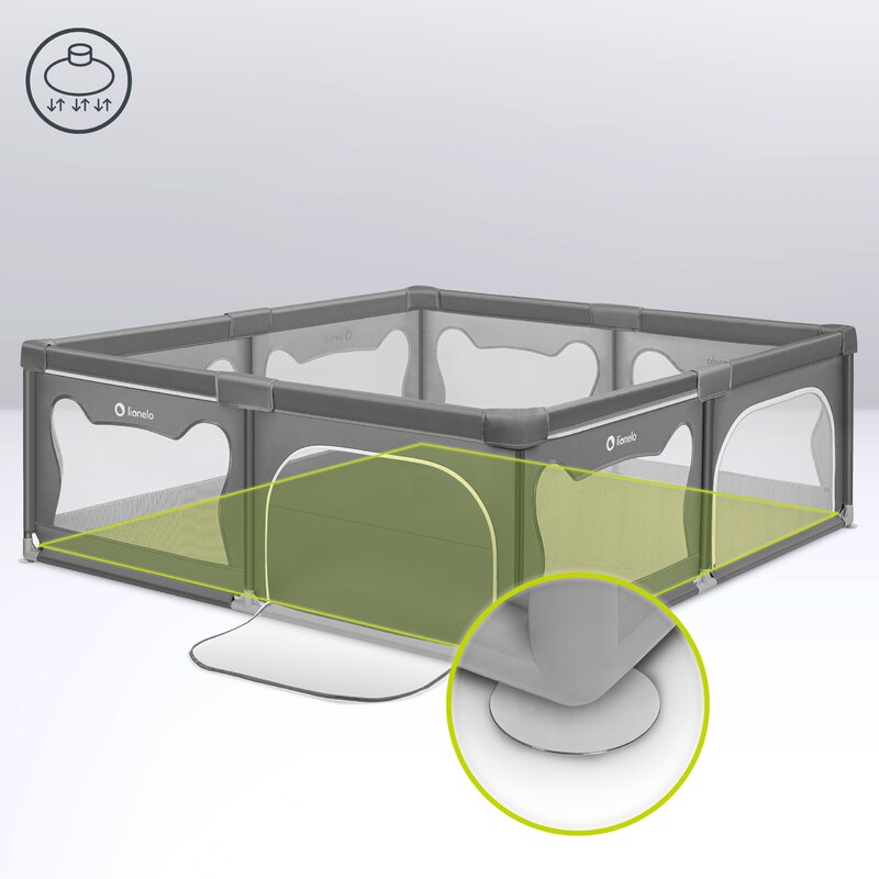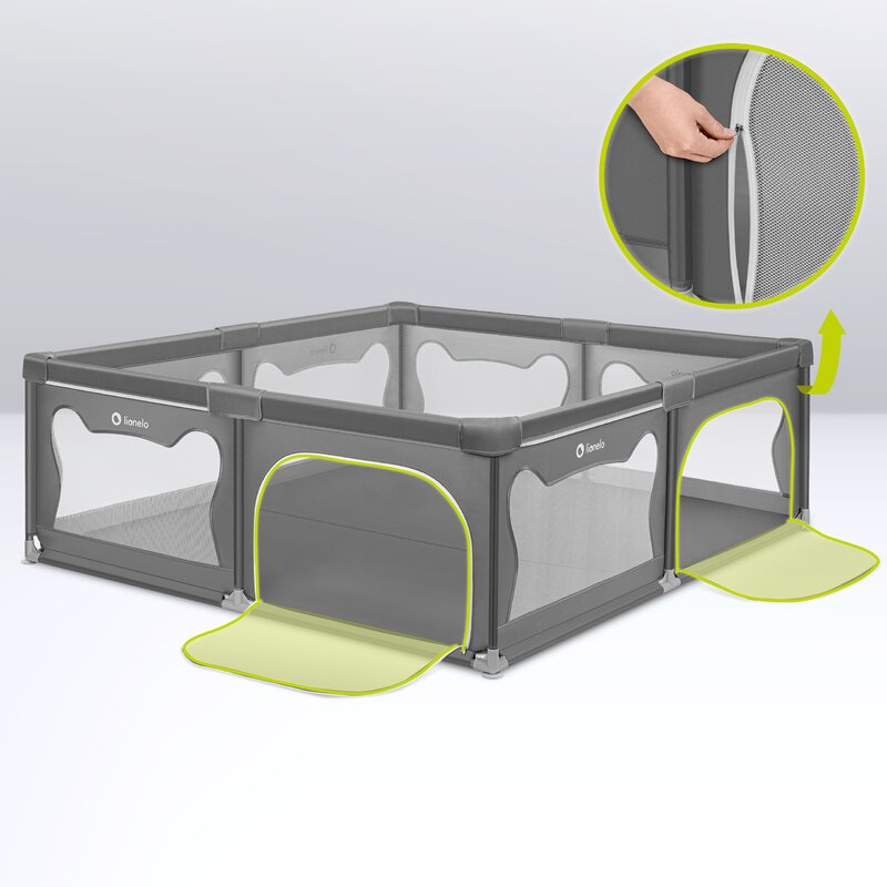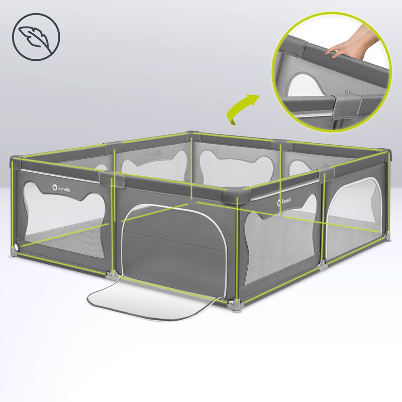 Tarc de joaca copii, Lionelo, Willow XL,180 x 200 cm, Pliere compacta, Include geanta de transport, Din plasa, Cu doua intrari laterale si fermoar, Cu ventuze pentru stabilitate, Conform cu EN 12227:2010, Gri