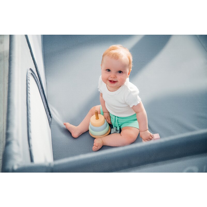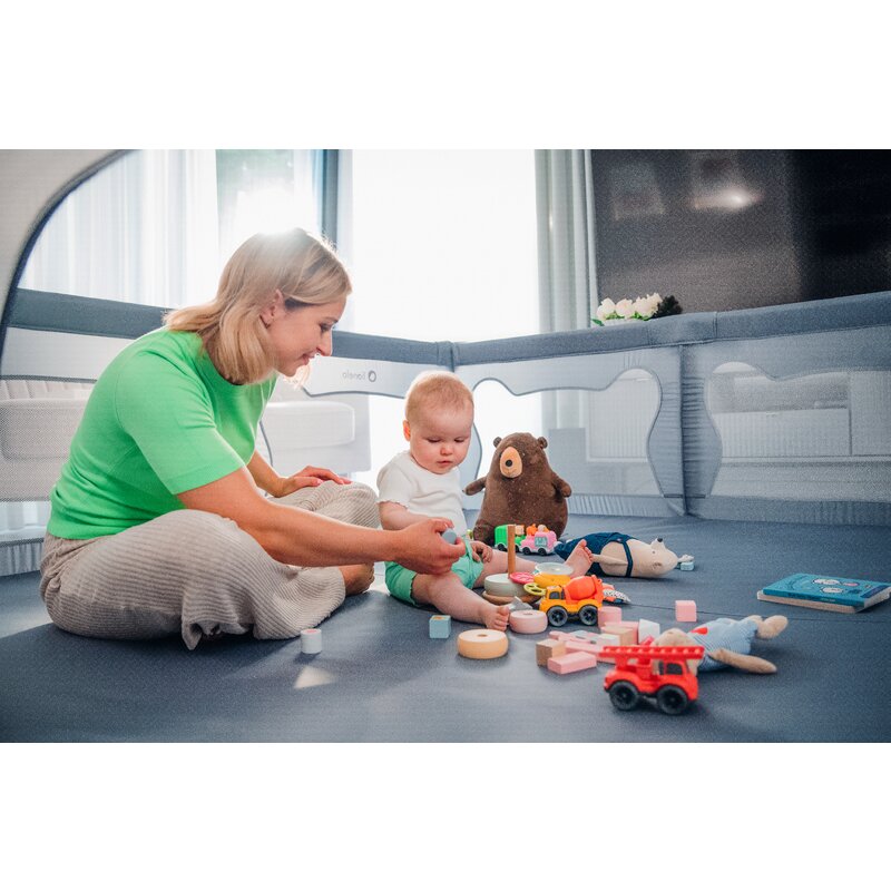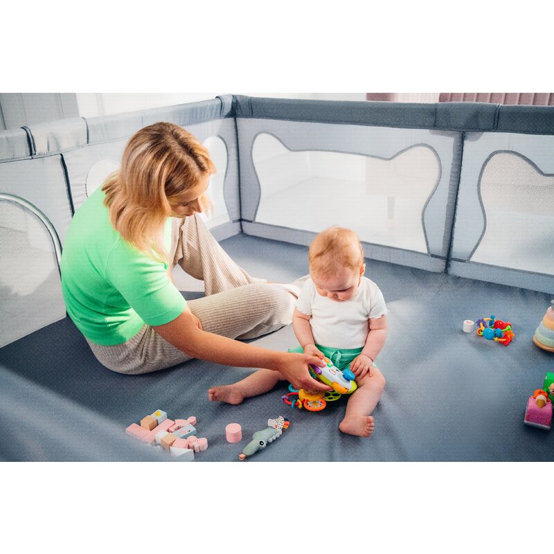 - Zona de joaca inchisa creeaza un mediu curat si sigur pentru copil, cu laturi din plasa pentru o vizibilitate usoara.
