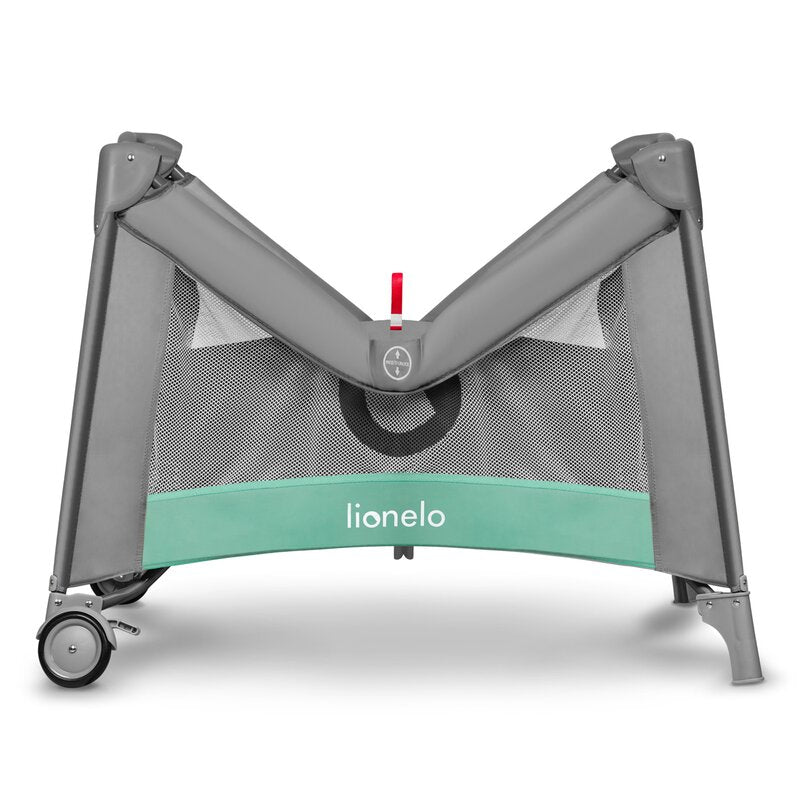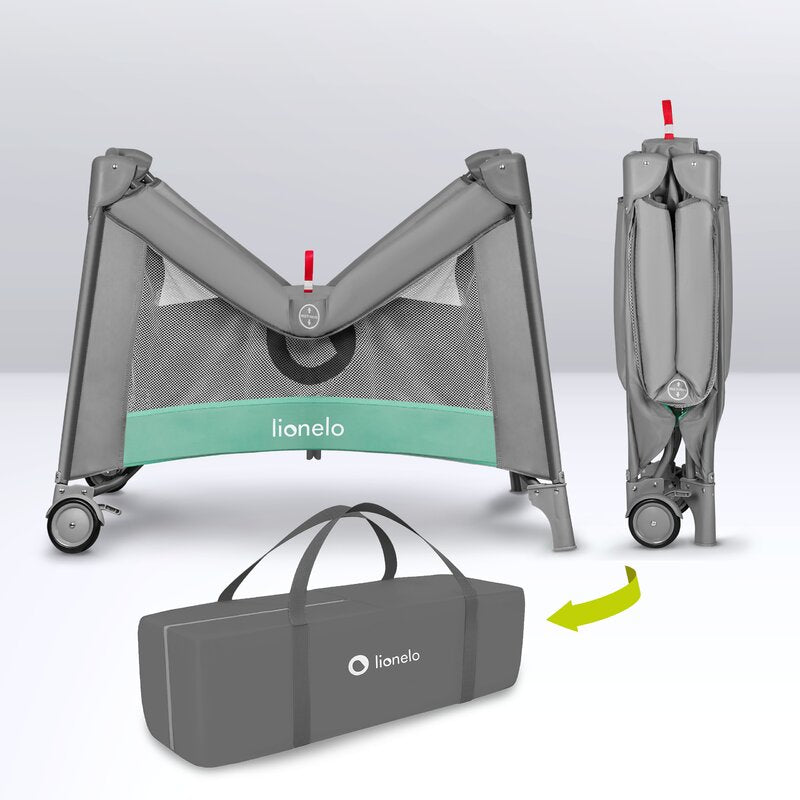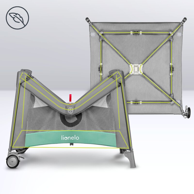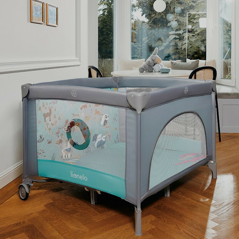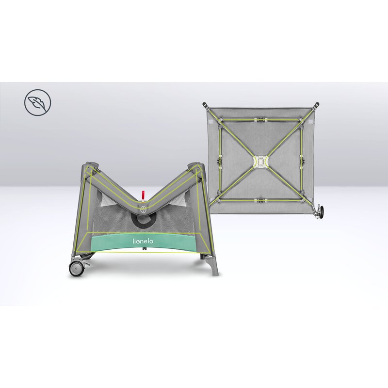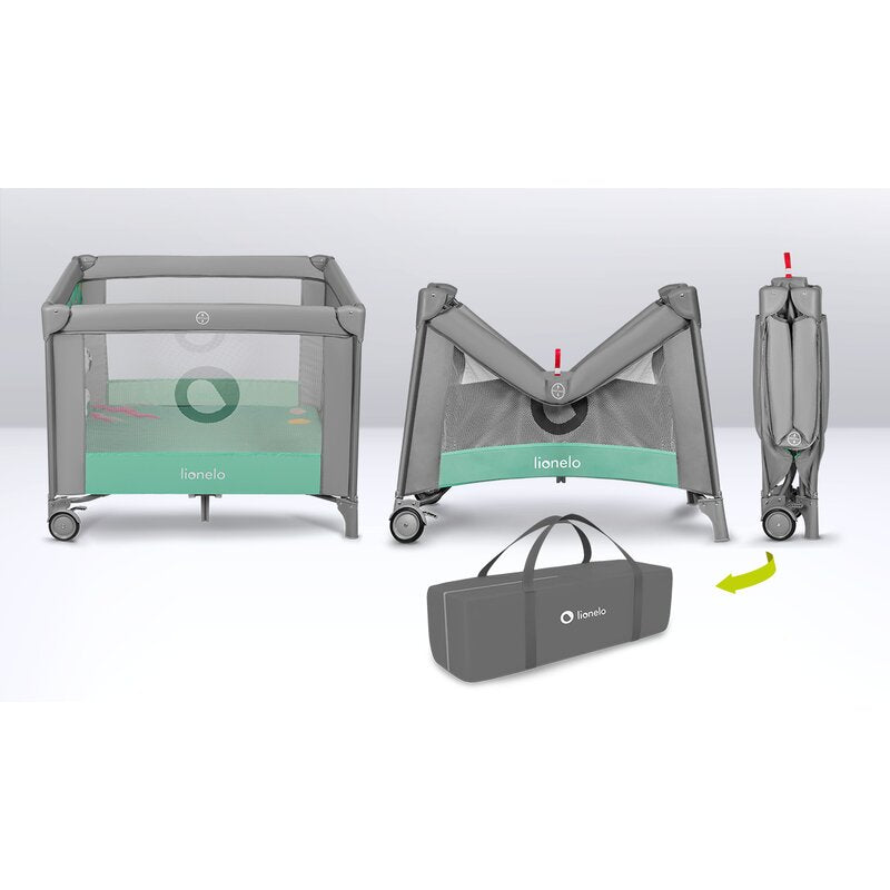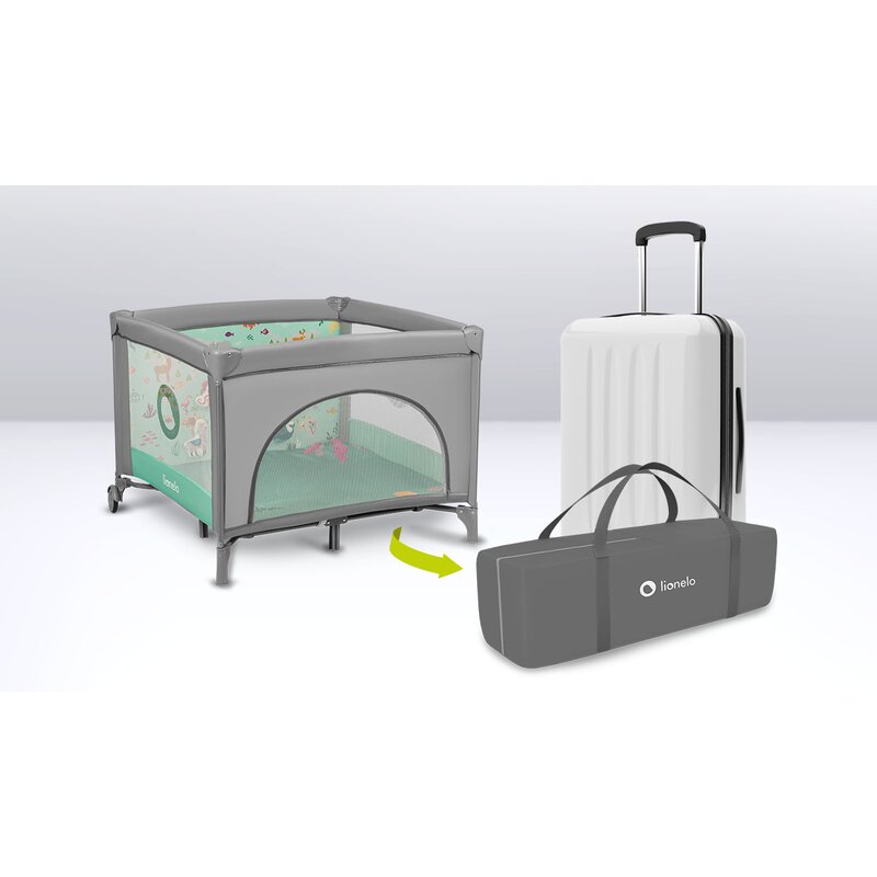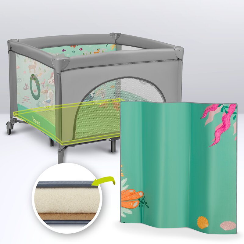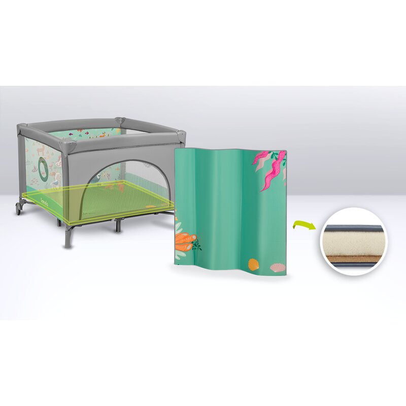 Tarc de joaca, Lionelo, Mille, Pliabil, Include covor educational incorporat cu 4 jucarii Velcro si geanta de transport, Cu roti si inchidere laterala, Saltea din spuma, 100x100 cm, Verde