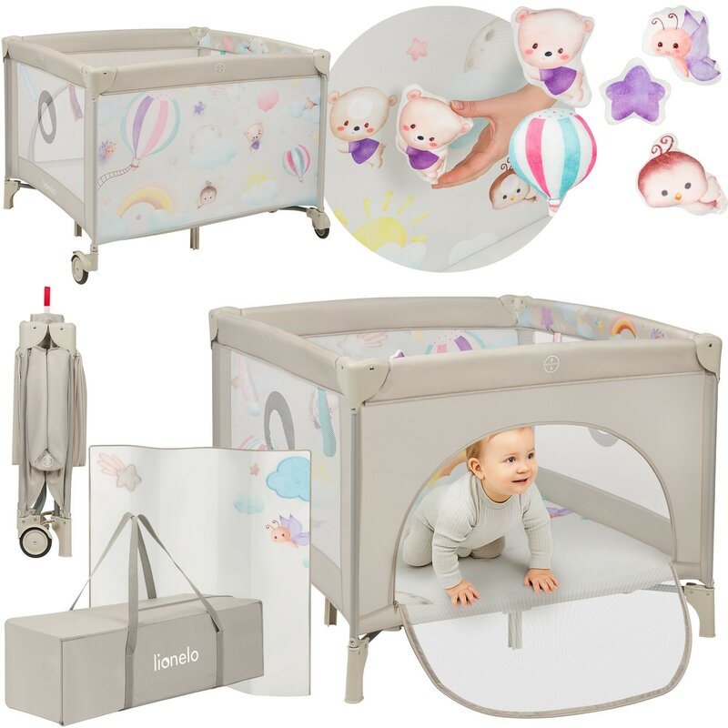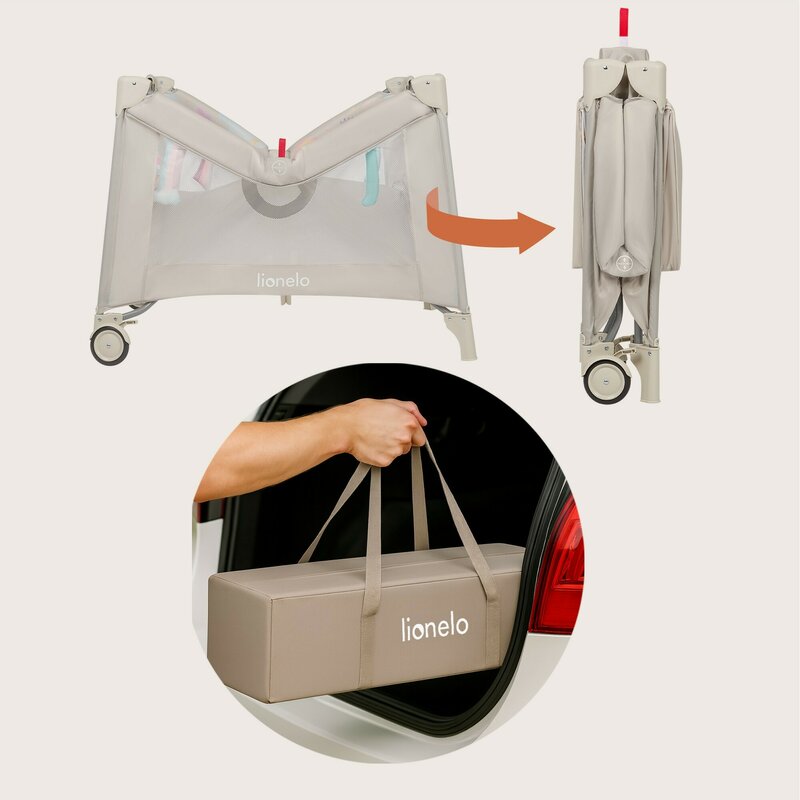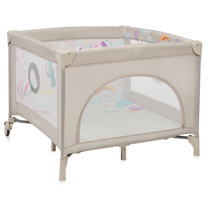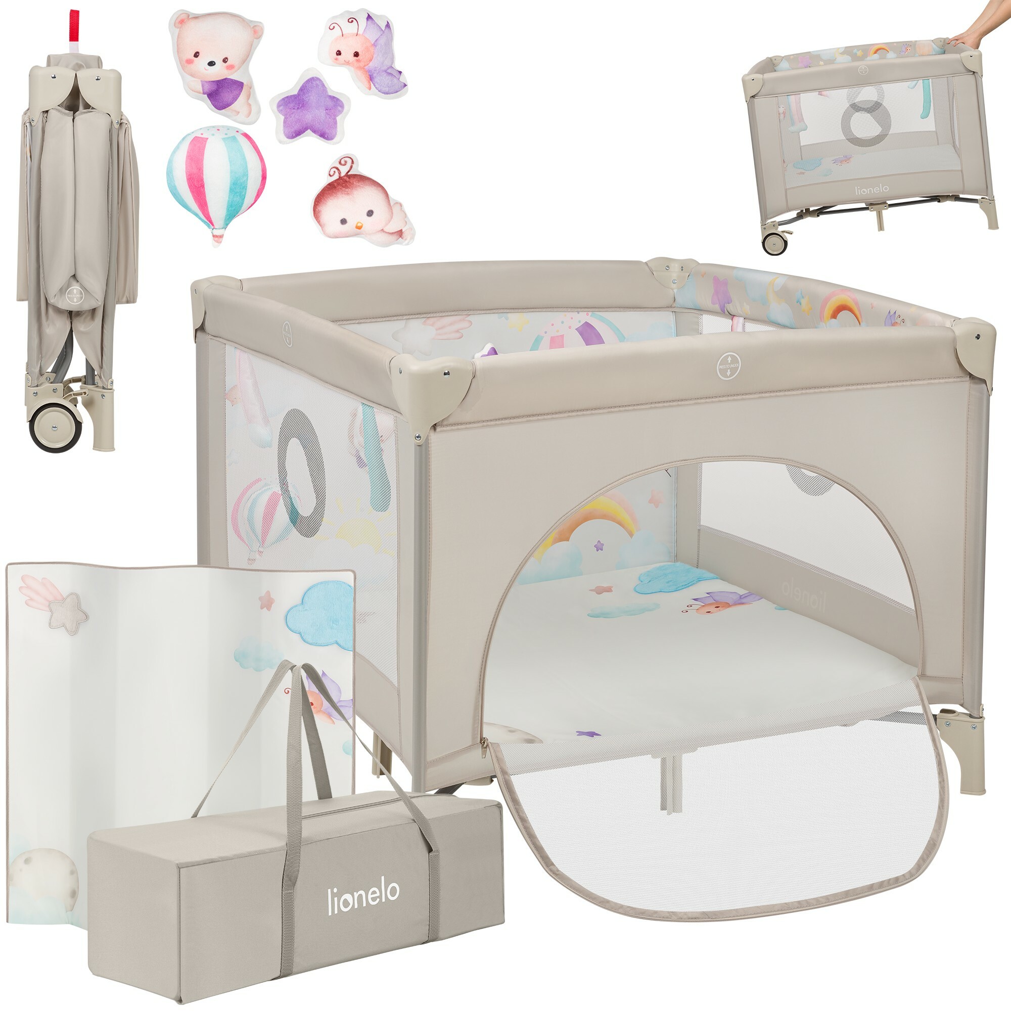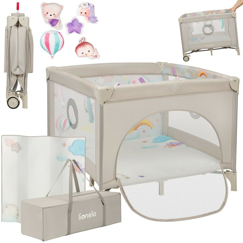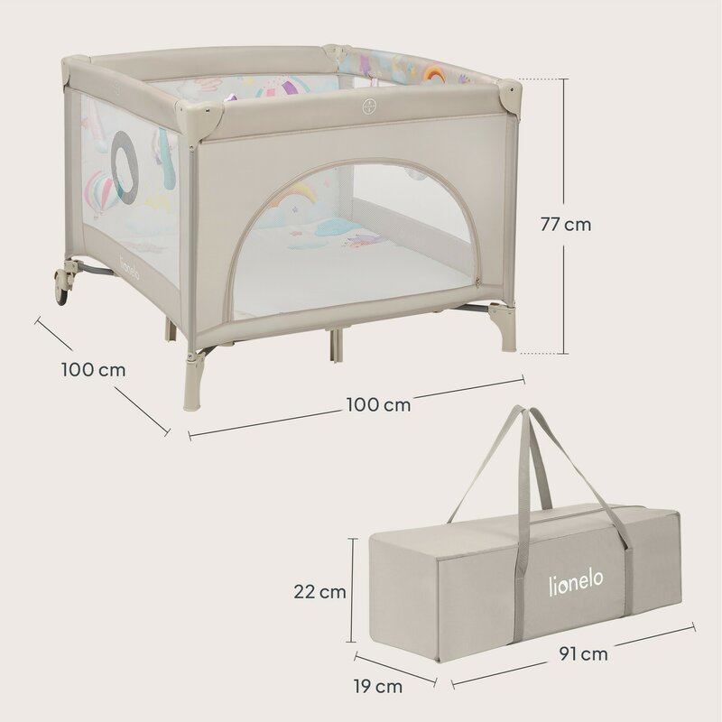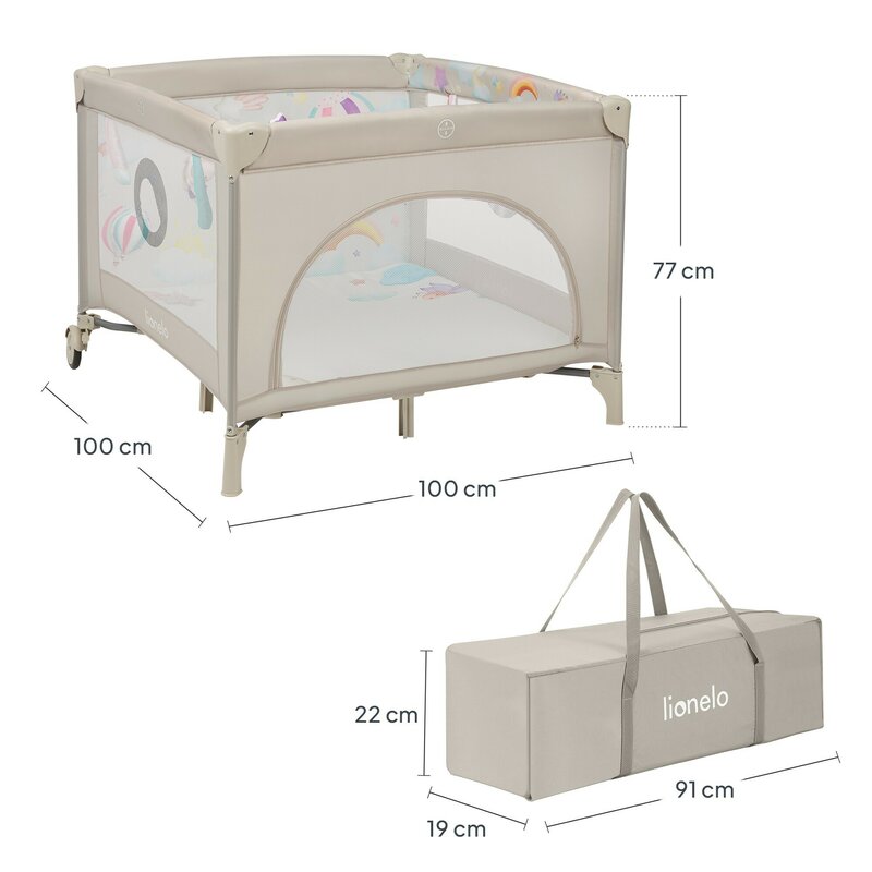 Tarc de joaca, Lionelo, Mille Plus, Pliabil, Include saltea cu densitate T25, 4 jucarii cu velcro, Manere textile, Geanta de transport, Cu roti si inchidere laterala, Pereti din plasa pentru vizibilitate si aerisire, 100 x 100 x 77 cm, Bej