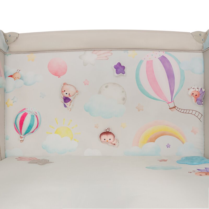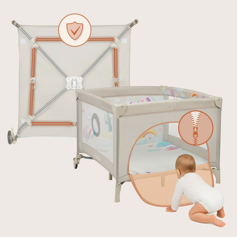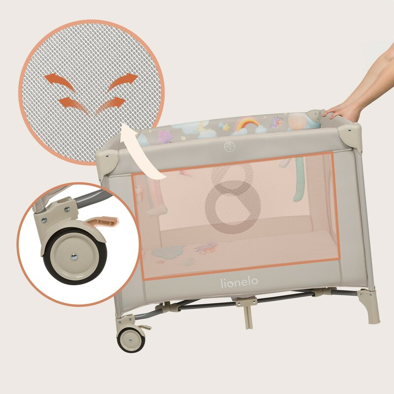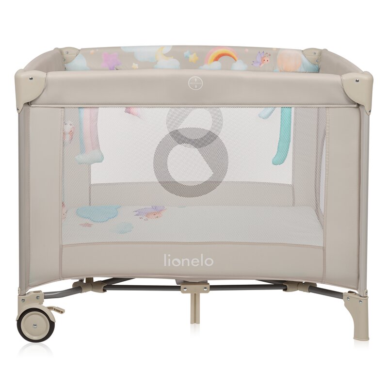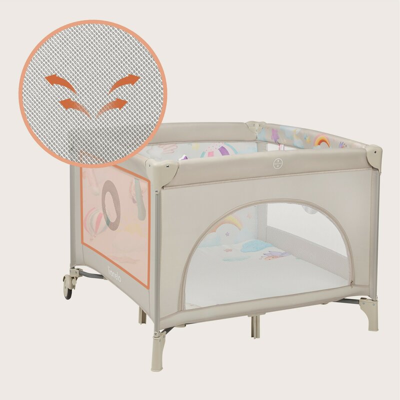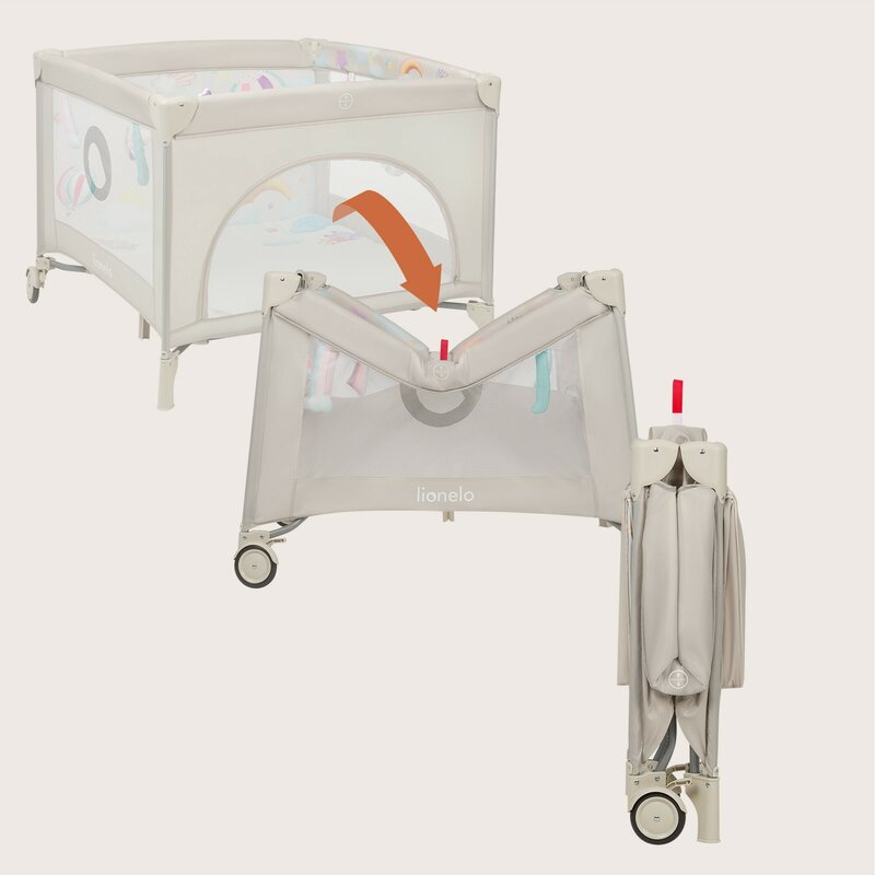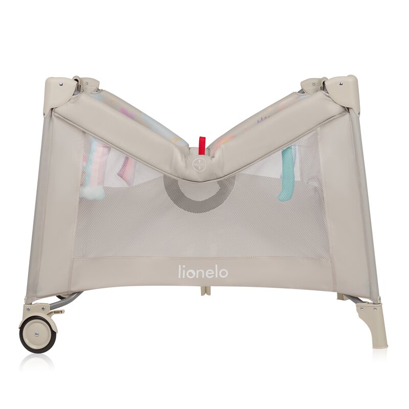 Tarc de joaca, Lionelo, Mille Plus, Pliabil, Include saltea cu densitate T25, 4 jucarii cu velcro, Manere textile, Geanta de transport, Cu roti si inchidere laterala, Pereti din plasa pentru vizibilitate si aerisire, 100 x 100 x 77 cm, Bej