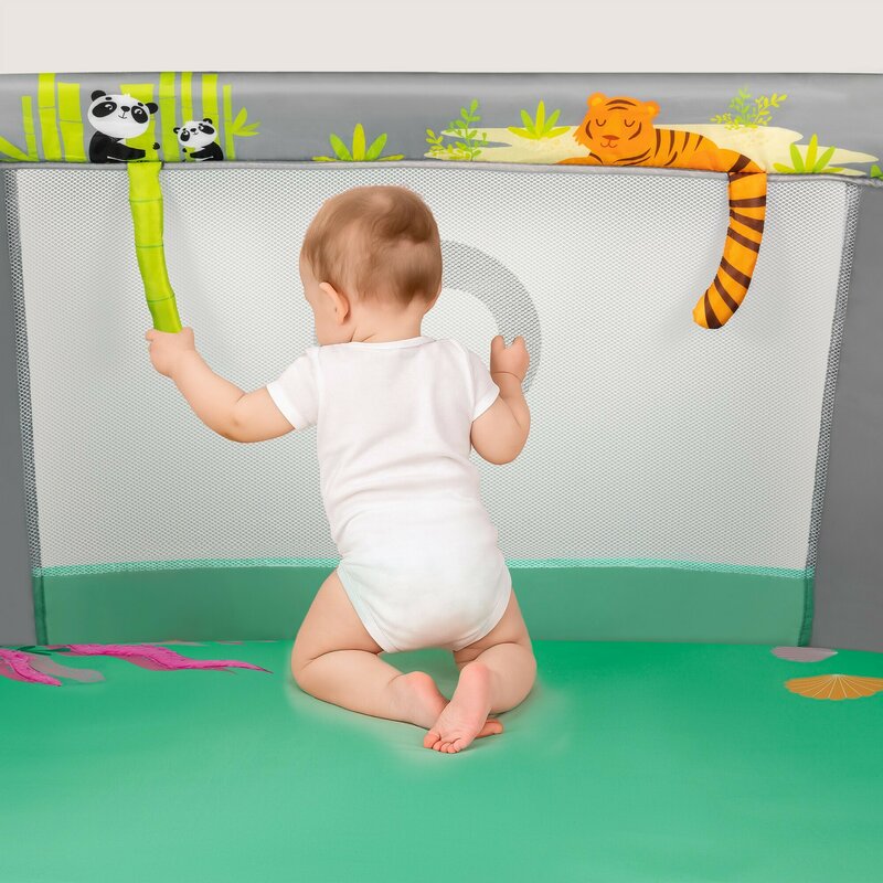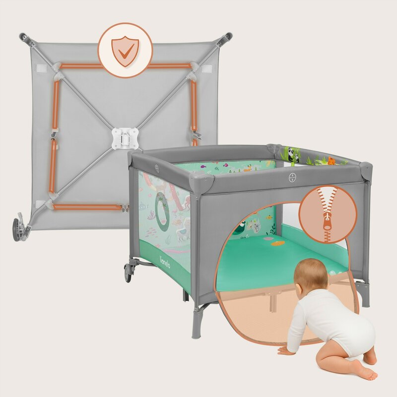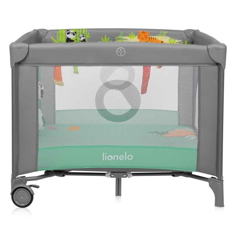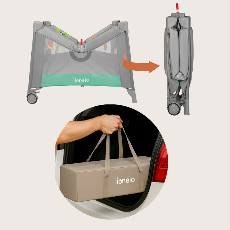 Tarc de joaca, Lionelo, Mille Plus, Pliabil, Include saltea cu densitate T25, 4 jucarii cu velcro, Manere textile, Geanta de transport, Cu roti si inchidere laterala, Pereti din plasa pentru vizibilitate si aerisire, 100 x 100 x 77 cm, Verde