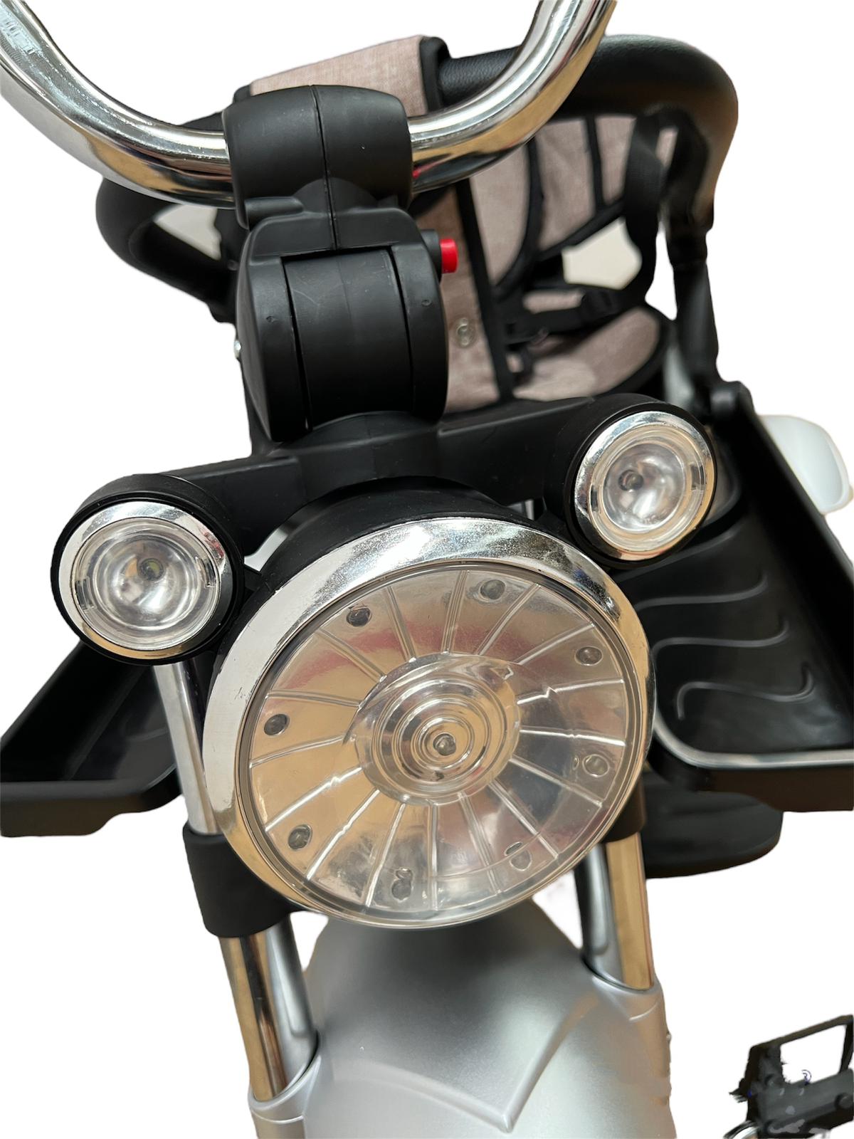 Tricicleta 5199 este o tricicleta evolutiva, +8 luni-4 ani, cu scaun rotativ sin pozitie somn, avand un design deosebit tip motoclicleta , prevazuta cu ansamblu de muzica si lumini ce ii vor incanta pe cei mici.