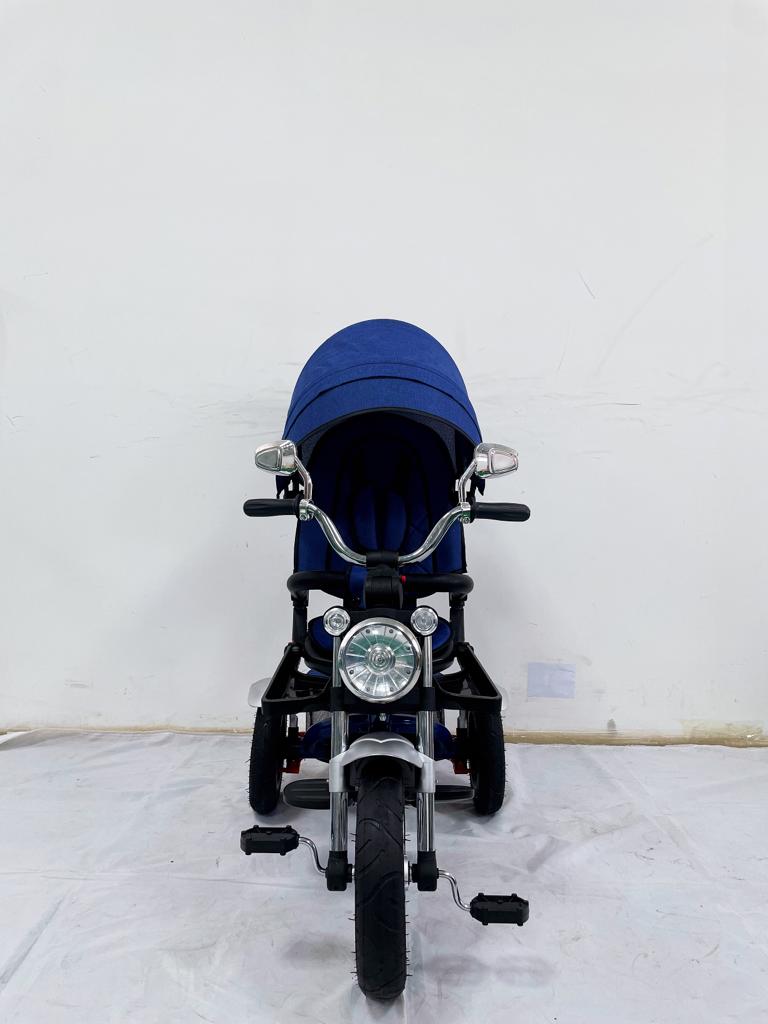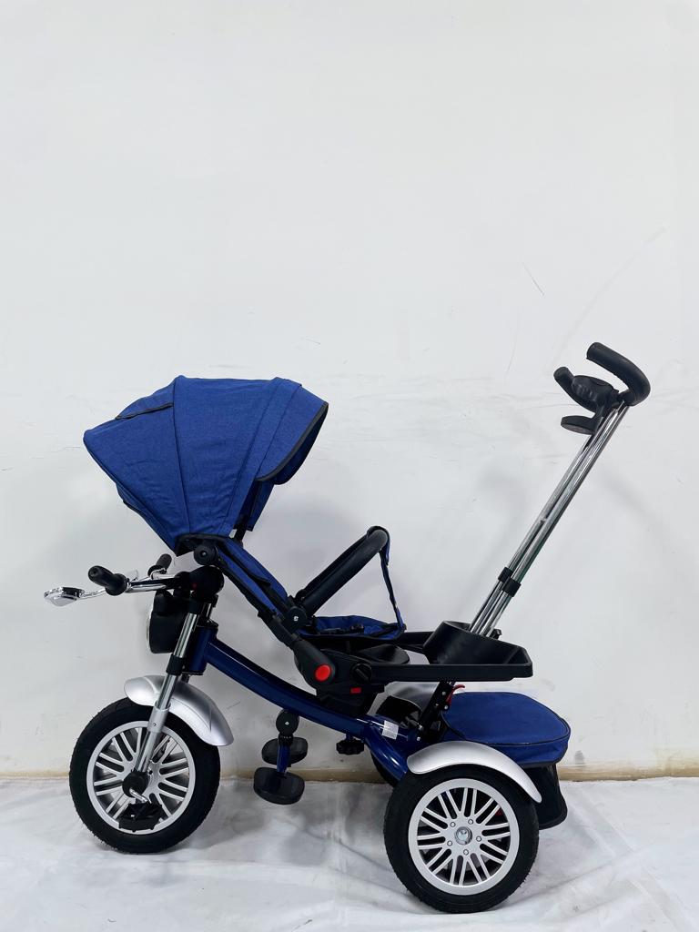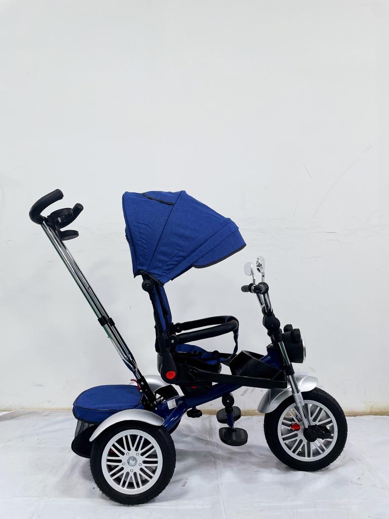 Tricicleta evolutiva, roti cauciuc, cu pozitie de somn, scaun rotativ si muzica distractiva, culoare ALBASTRU BBD5199A