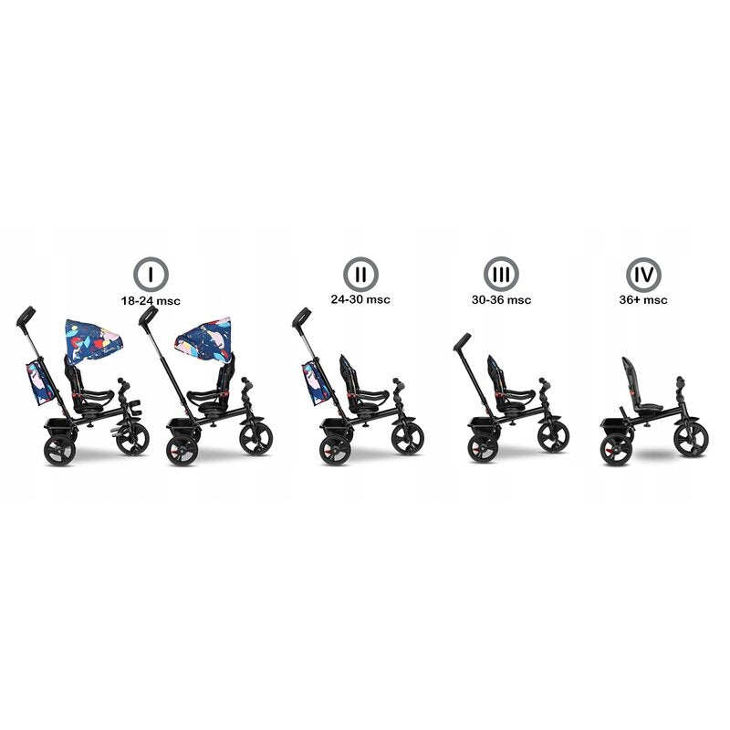 Haari isi ajusteaza functiile in functie de nevoile si varsta micului utilizator. Un scaun rotativ permite transportul copilului in pozitie orientata spre inainte sau spre spate. Cand copilul are 18 luni, poate incepe sa foloseasca produsul ca un carucior. Cand poate ajunge la pedale, suportul pentru picioare nu mai este necesar si ii poti permite copilului sa pedaleze, astfel incat sa preia controlul complet in timp.