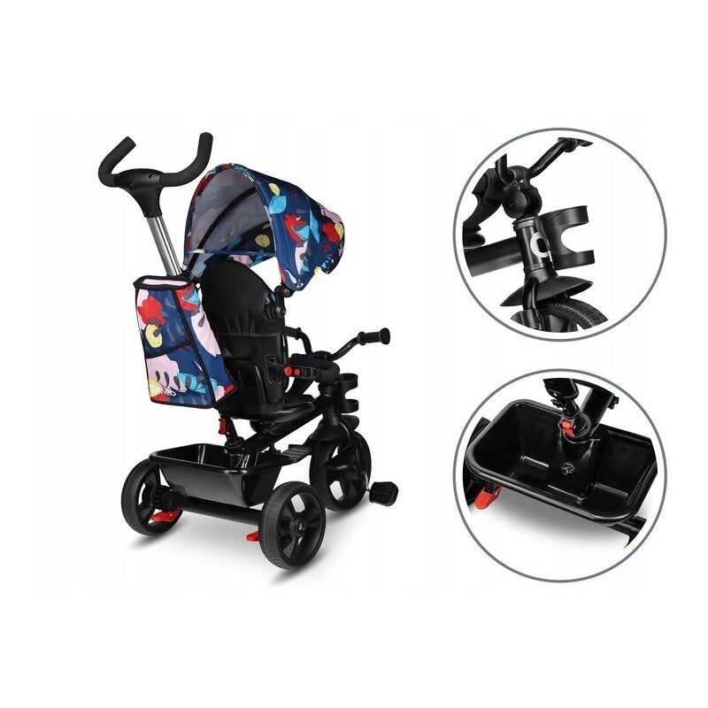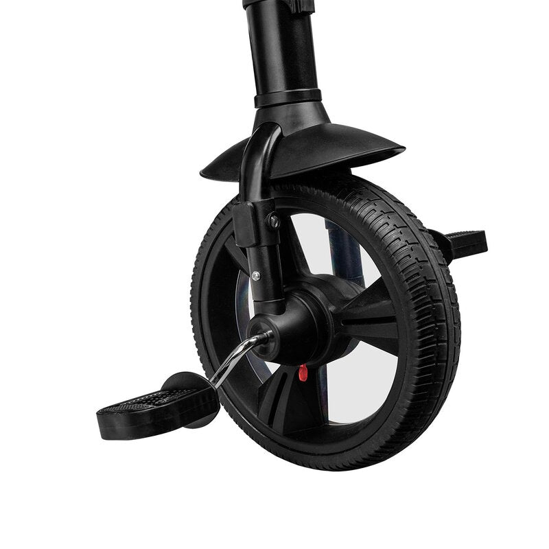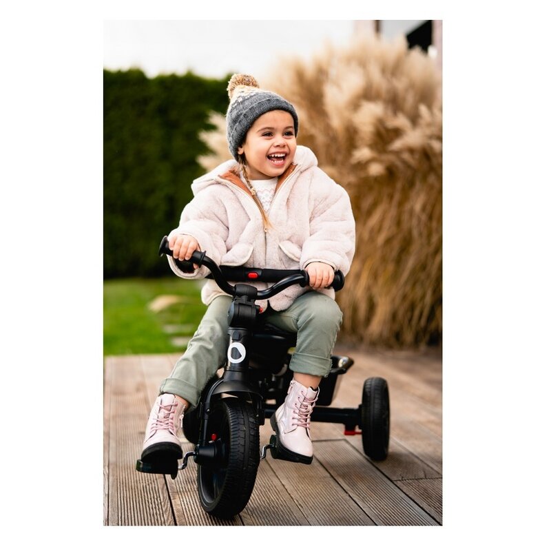 Tricicleta Haari 2 in 1 este echipata cu roti usoare cu banda de rulare, realizate din PU de inalta calitate. Capacul deasupra rotii din fata functioneaza ca un aparator de noroi si protejeaza picioarele copilului impotriva incurcarii. Produsul are un suport pentru picioare pentru copiii care inca nu pot ajunge la pedale. Utilizarea unei roti libere permite copilului sa pedaleze, dar parintele pastreaza controlul complet asupra directiei si vitezei de deplasare. Exista un ajutor suplimentar sub forma unui maner reglabil, a carui inaltime poate fi adaptata la inaltimea proprie.
