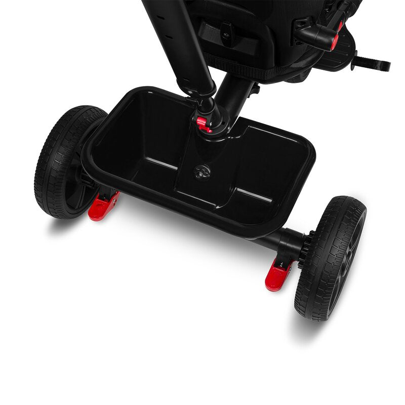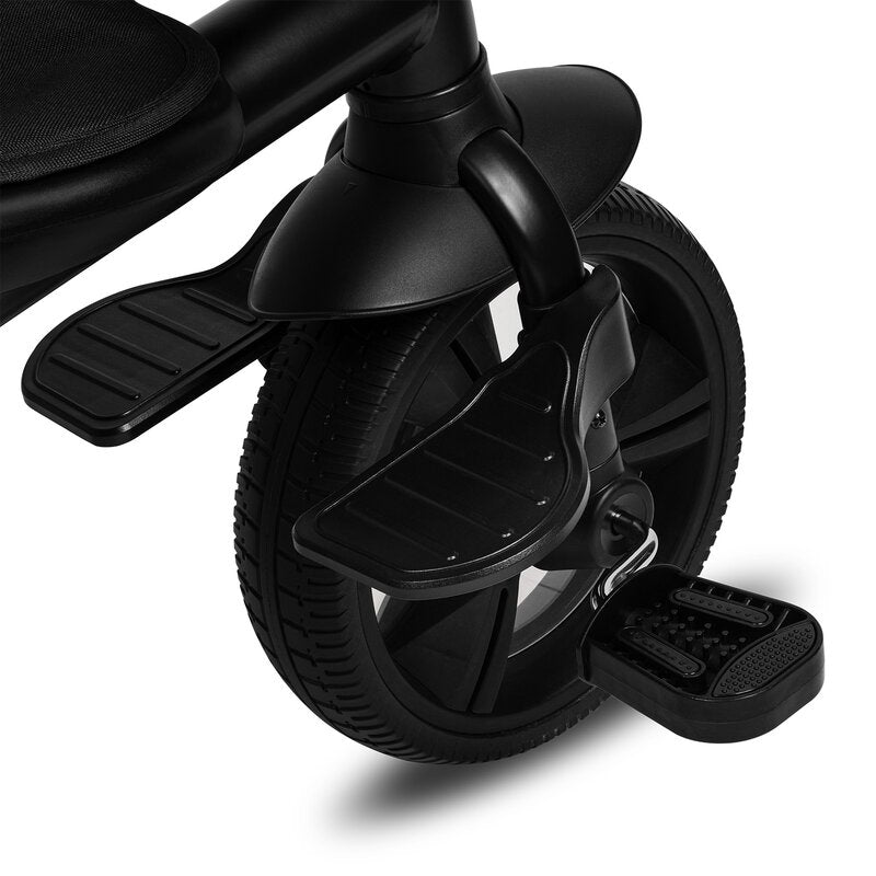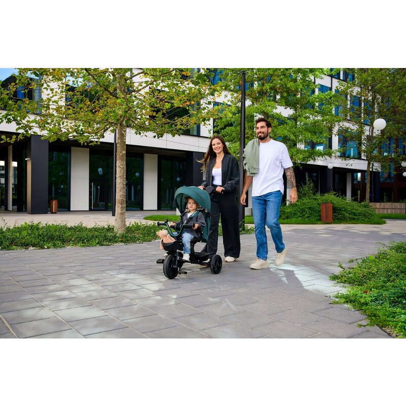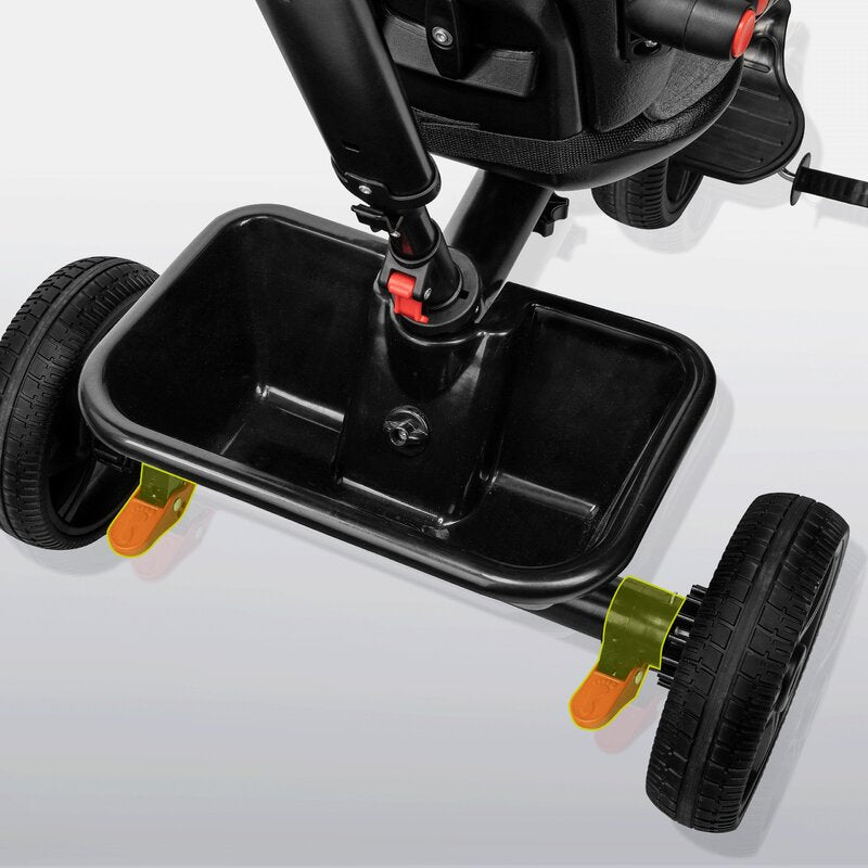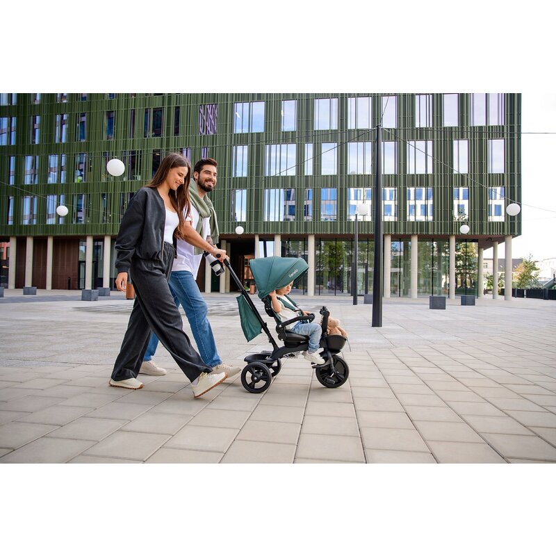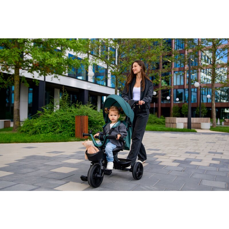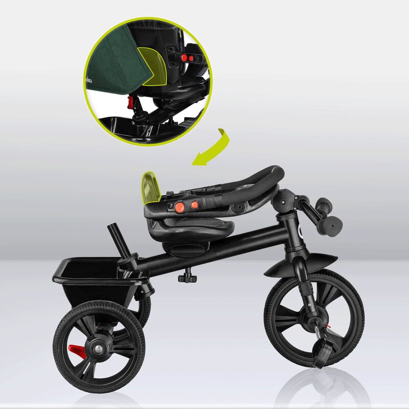 Scaunul rotativ permite orientarea atat cu fata, cat si cu spatele, oferind libertate totala in functie de contextul plimbarii. Tricicleta poate fi folosita in diverse moduri – de la modul de impingere tip carucior, pana la utilizarea clasica, cu pedale.