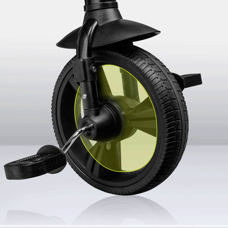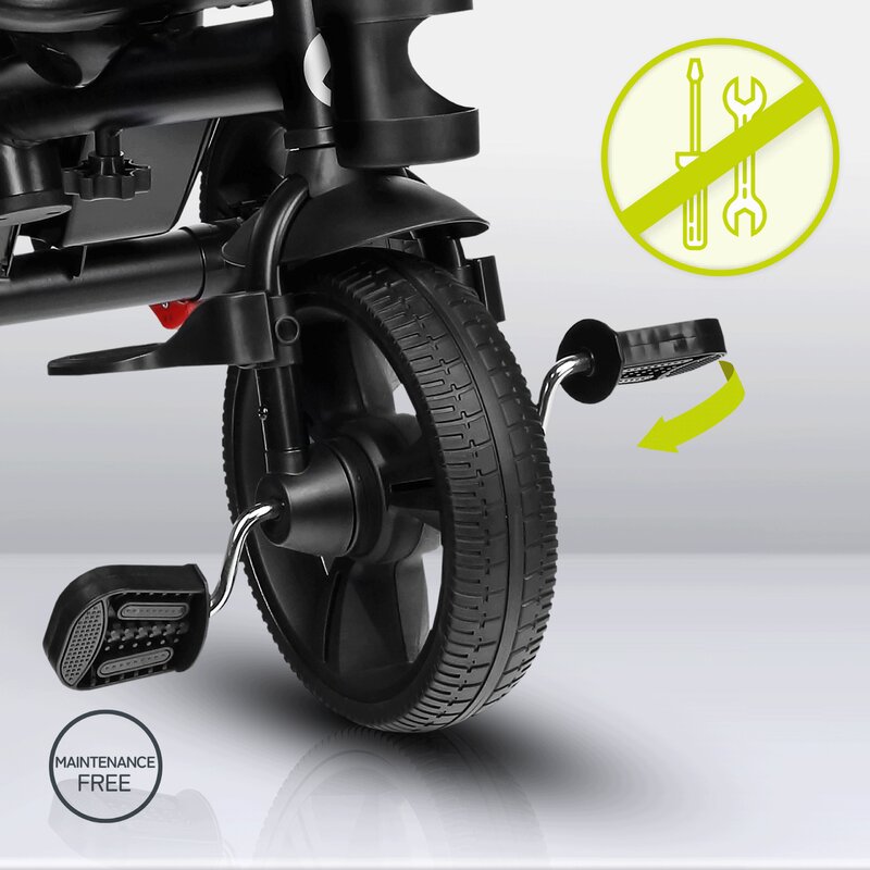 Echipata cu roti usoare din PU de inalta calitate, cu banda de rulare antiderapanta, tricicleta ofera stabilitate si aderenta excelenta. Capacul de protectie de deasupra rotii frontale previne stropirea sau contactul accidental. Suportul pentru picioare este pliabil, iar sistemul de roata libera permite parintilor sa controleze directia si viteza fara intreruperi.