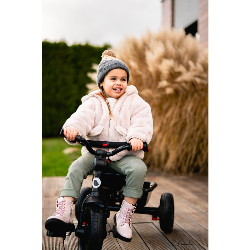 Tricicleta Haari se pliaza rapid, fara unelte, si devine usor de transportat sau depozitat. Include o copertina reglabila cu plasa transparenta integrata, suport pentru sticla sau cana, o geanta pentru articole esentiale si un cos spatios pentru accesorii. Toate componentele auxiliare pot fi detasate cu usurinta in functie de preferintele parintilor.