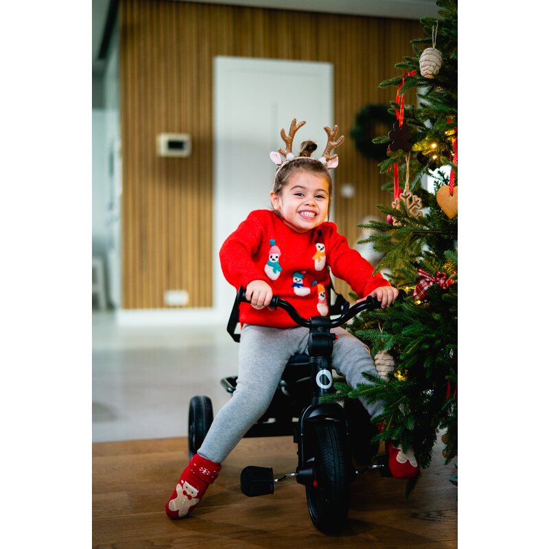 Centurile de siguranta in 3 puncte, dotate cu huse moi, ghidonul cu insertii antiderapante si elementele fluorescente de pe copertina contribuie la o experienta sigura in orice moment al zilei. Franele de pe axul din spate asigura opriri rapide si control total. Tricicleta este testata si certificata conform standardului european EN 71, in cadrul laboratorului independent Intertek.