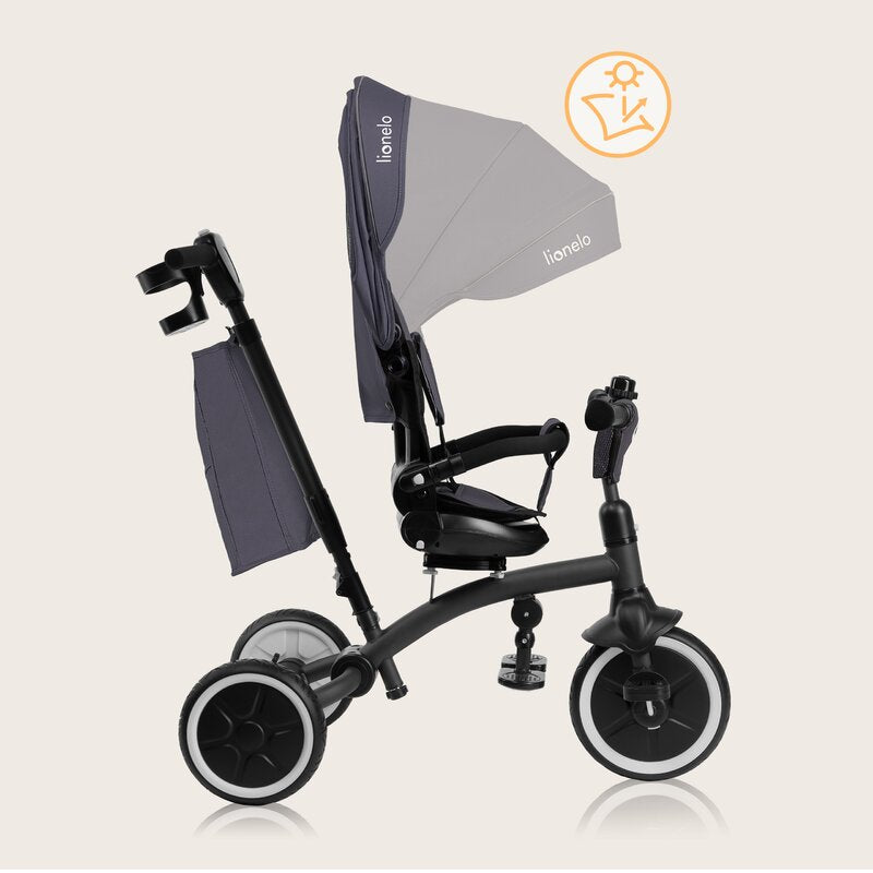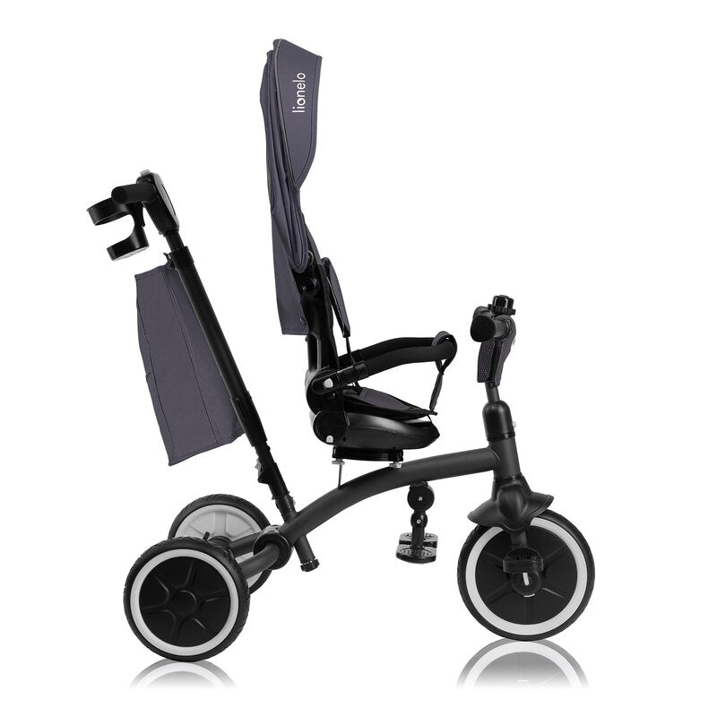 Tricicleta copii, Lionelo, Tris Plus, Ultrapliabila, Multifunctionala, Pana la 25 kg, Inclinare spatar in fata si in spate, Suport picioare, Control al directiei, Scaun reversibil, Rotire 360 grade, Conform cu EN71, 9 luni-5 ani, Gri