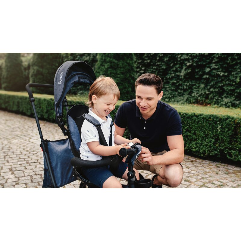 Lionelo Tris este o tricicleta multifunctionala destinata copiilor cu varsta de cel putin 1,5 ani. Un scaun bine conturat, cu spatar reglabil, permite transportul micilor utilizatori in pozitie cu fata inainte sau cu spatele, in timp ce o roata libera, pedalele blocate si un maner util garanteaza o directie usoara. Pe masura ce copilul creste, Tris isi poate schimba functia. In acest caz, este posibil sa se desprinda suportul pentru picioare, sa se deblocheze pedalele si apoi sa se lase copilul sa mearga singur.