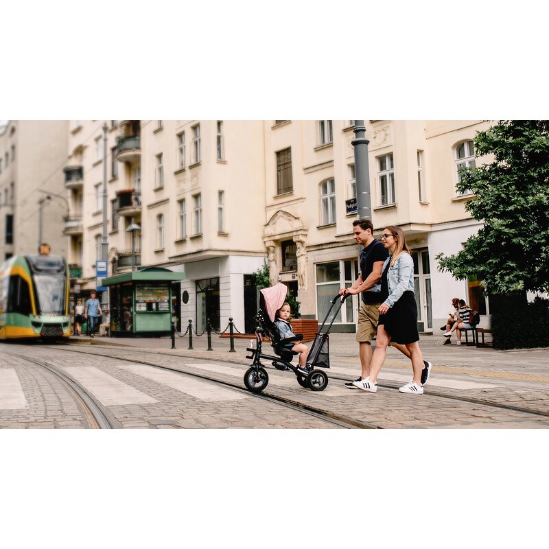 Tricicleta creste odata cu copilul. Cu scaunul montat in fata sau in spate, capotina si suportul pentru picioare asigura confortul copiilor, in timp ce centurile si bara de protectie se ocupa de siguranta. -