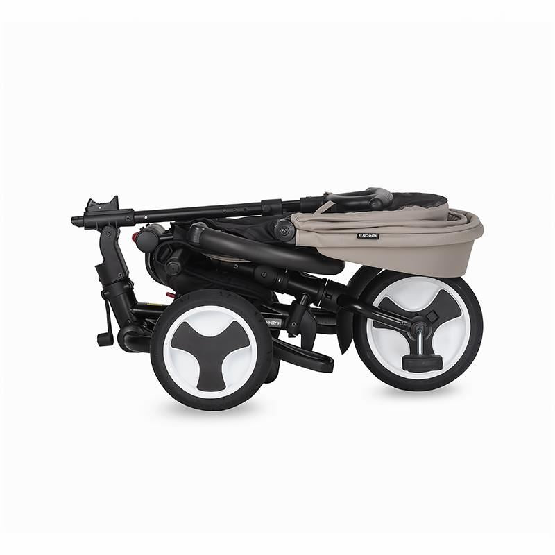 Usor de asamblat, tricicleta Spectra nu da batai de cap parintilor si promoveaza un stil de viata activ, la aer liber. Gratie sistemului de pliere usor de utilizat, produsul poate fi luat oriunde intrucat incape in cele mai mici spatii de depozitare si in portbagajul oricarei masini. Copertina tricicletei ofera protectie UV, astfel ca o puteti utiliza chiar in cele mai toride locatii. Functia de roata libera permite blocarea rotii astfel inca chiar daca micutul pedaleaza roata fata nu se va invarti, deci utilizarea produsului de catre copiii mai mici nu constituie o problema. Functia de ghidon liber permite copilasului sa manevreze ghidonul fara a modifica directia tricicletei. Pentru confortul parintilor, tija auxiliara este telescopica, iar frana dubla localizata la nivelul rotilor din spate confera extra stabilitate in momentul stationarii.Pe masura ce creste, toate elementele tricicletei se detaseaza astfel ca, in cele din urma, produsul va putea fi utilizat ca o tricicleta clasica cu sezut, ghidon si pedale.