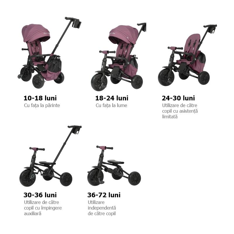 - Pe parcurs, se transformă în tricicletă independentă: piesele utive (centură, bârnă parentală, copertină) pot fi îndepărtate pentru libertate totală.