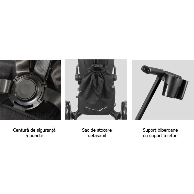 - Organizare inteligentă: include o geantă de depozitare, bag de scutece şi suport dublu pentru pahar și telefon.