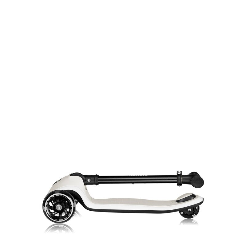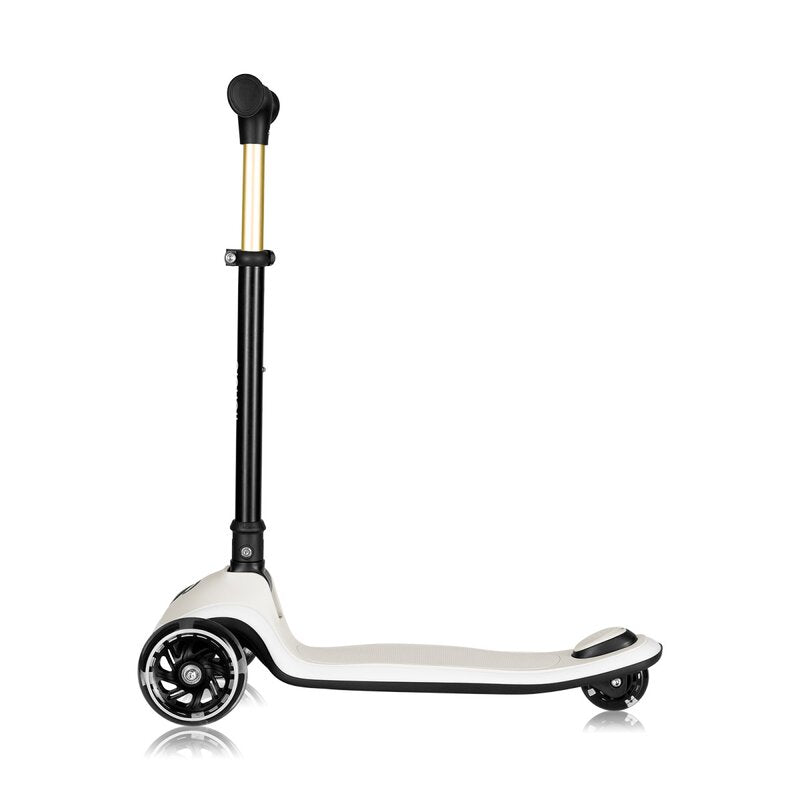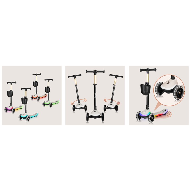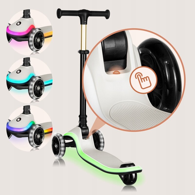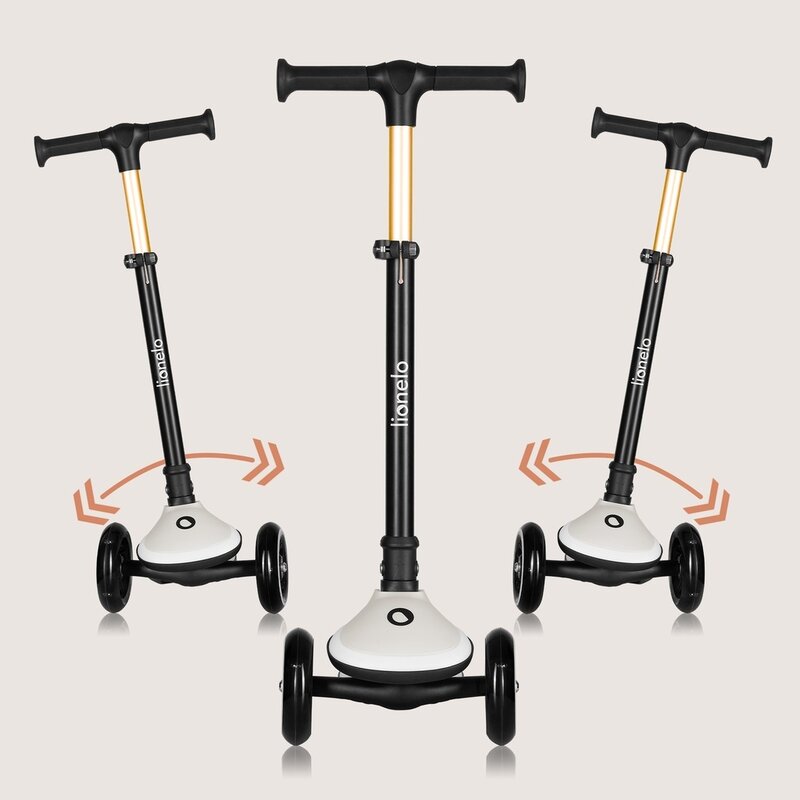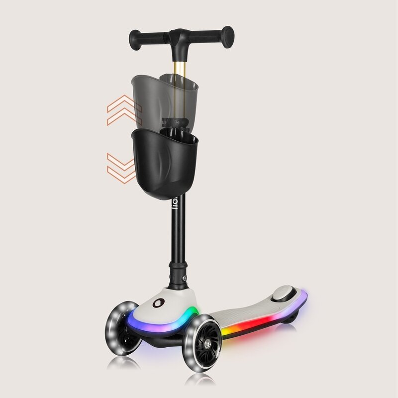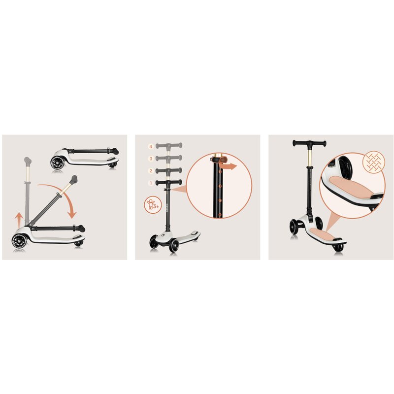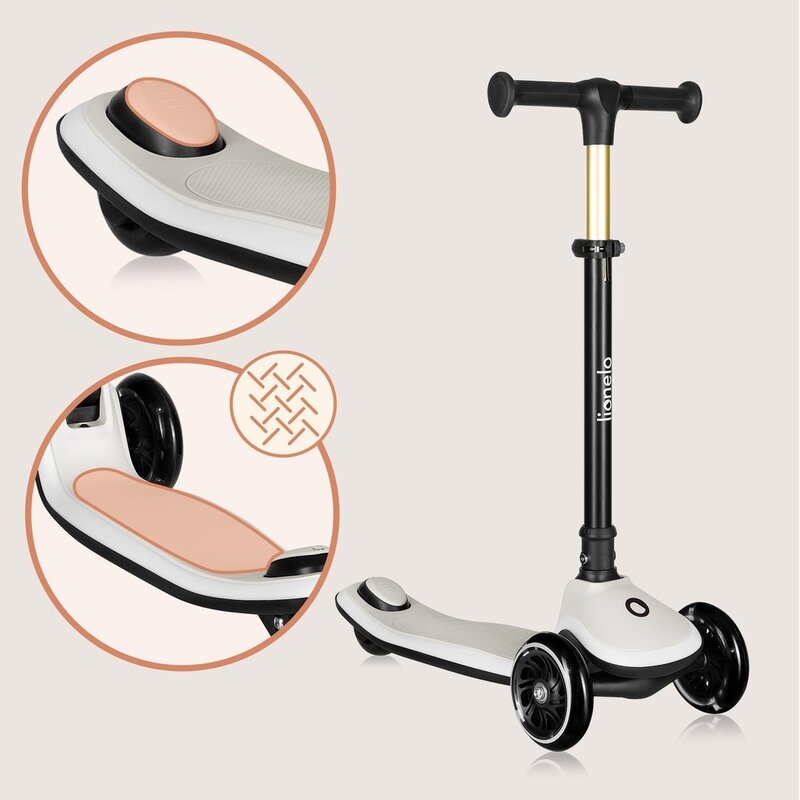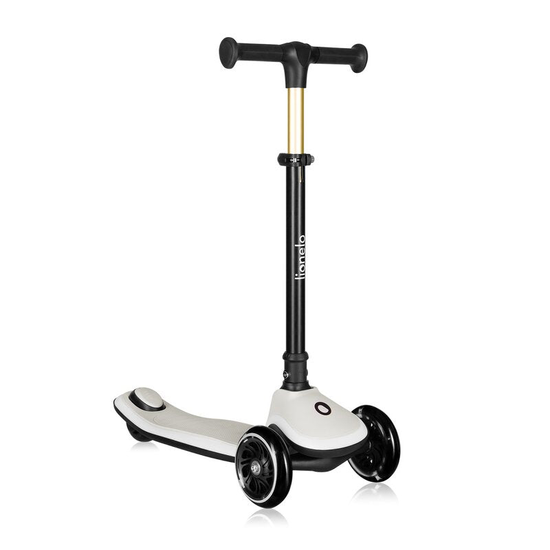 Trotineta pentru copii, Lionelo, Mey, Ultrapliabila, Cu lumini si cosulet, Maner ajustabil pe inaltime, 3 ani+, Pana la 50 Kg, Ultra usor, 2.8 kg, Conform cu standardul EN71-1/2/3, Certificata Intertek, Bej