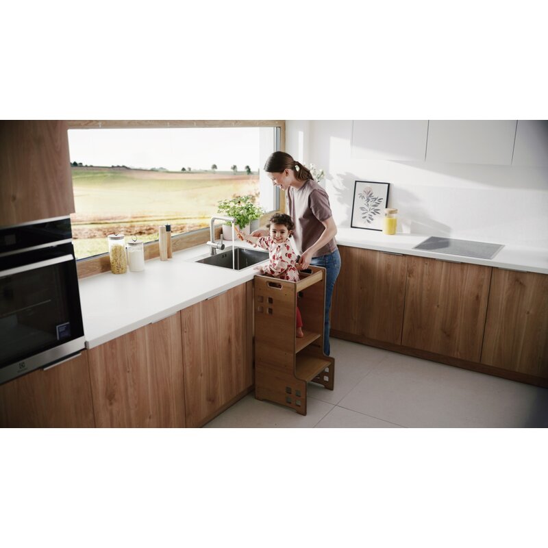 Ajutorul nu este util doar in bucatarie, ci si in baie – spre exemplu, atunci cand copilul se spala pe dinti. Odata ce copilul creste, mobilierul poate fi transformat intr-o mini biblioteca pentru camera lui! Este o solutie ecologica si economica: nu mai este nevoie sa cumparati piese de mobilier suplimentare.