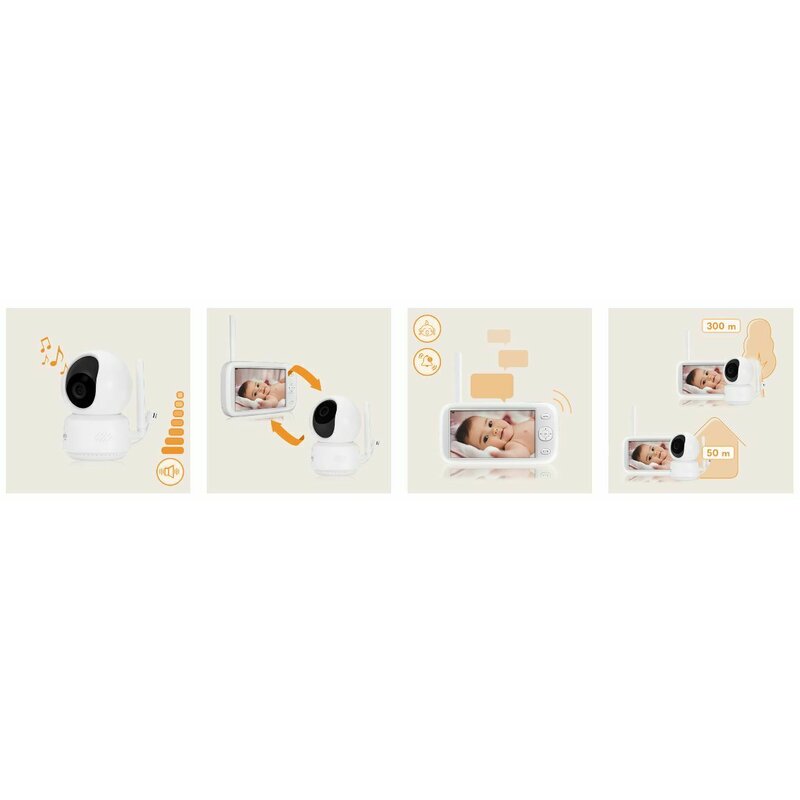 Camera rotativa la 360 grade poate fi controlata de la distanta si poate urmari automat copilul daca acesta se deplaseaza in afara campului sau vizual. Senzorii de miscare si sunet cu un sistem de notificare automata faciliteaza semnificativ ingrijirea. Liniile melodioase preincarcate si sunetele ajuta la adormirea copilului, iar comunicarea bidirectionala permite atat auzirea, cat si vorbirea cu copilul. Monitorul pentru bebelusi ofera un sunet si o imagine clare, fara intarzieri. Noaptea, fara iluminare suplimentara, camera poate vedea pana la 5 metri, iar LED-ul din fata poate fi oprit pentru a nu deranja copilul. Bateria asigura pana la 8 ore de utilizare.