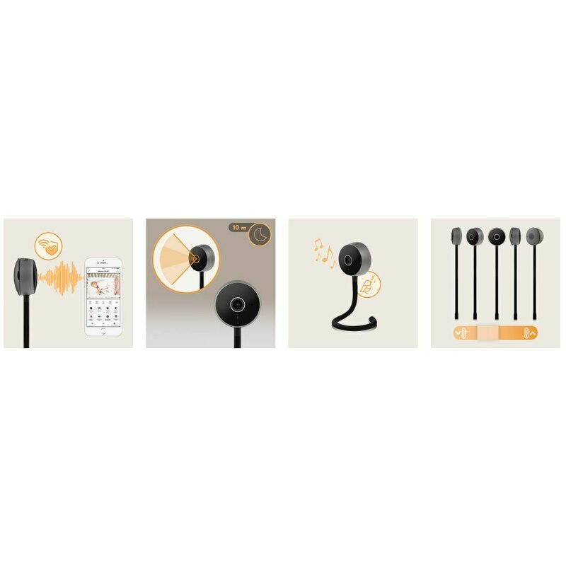 Dispozitivul detecteaza miscarea si sunetele din mediul copilului si notifica imediat parintele. In plus, este echipat cu senzori de umiditate si temperatura, oferind un plus de siguranta. Functia de comunicare bidirectionala si melodiile de leagan ajuta la linistirea bebelusului.